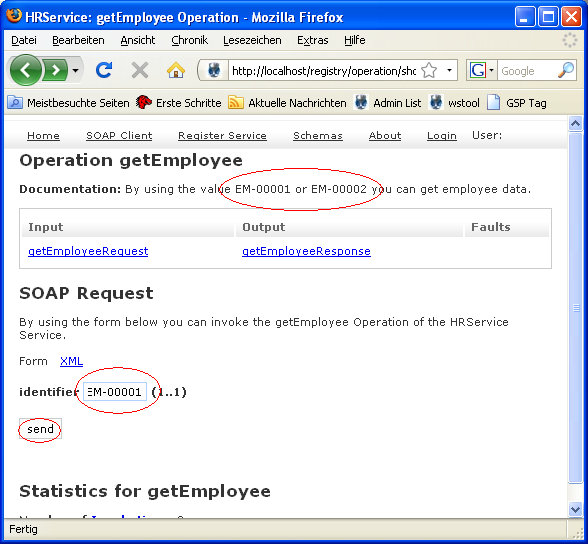 In the top box you can see the request you just have send. In the bottom box you get the response. There you see that EM-00001 belongs to John Doe. Press the "use this request as ping" link to set the ping request for availability testing.
