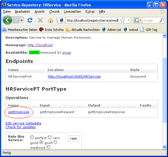 On the service page search for the operations table. It lists all the available operations of the service. You will find a operation called getEmployee. Click the link and the registry will create a from for you so you can type or paste the parameters.
